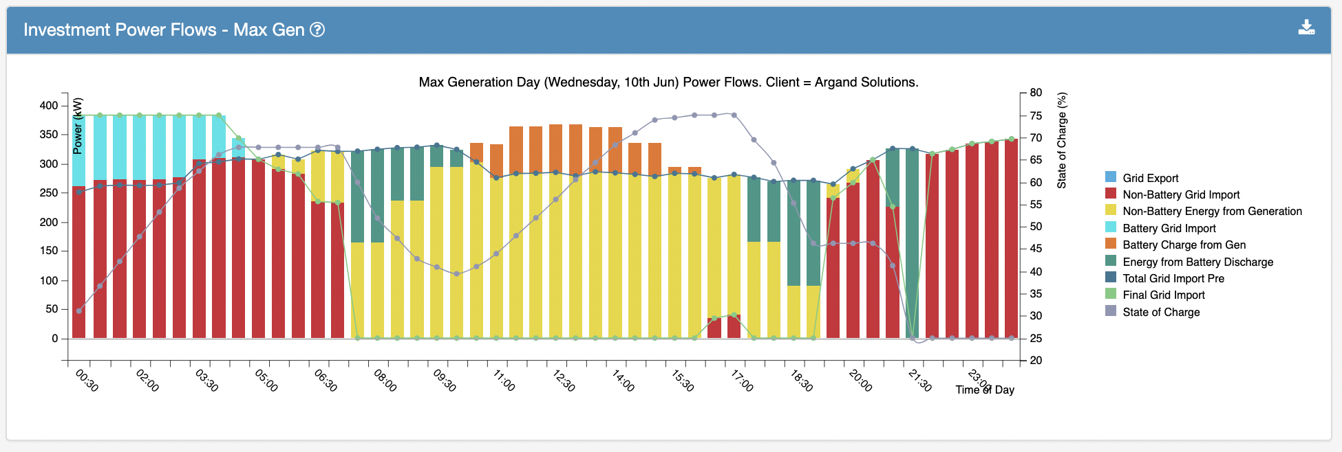 An example for a specific day is shown below where the client has an FA = 0.25 which implies a maximum state of charge (SoC) of 75% and minimum (SoC) of 25%.
